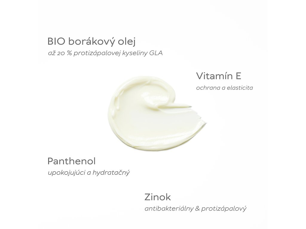 SLOŽENÍ: Aloe Barbadensis Leaf Juice*, Calendula Officinalis - Helianthus Annuus Seed Oil*, Borago Officinalis Seed Oil*, Simmondsia Chinensis Seed Oil*, Caprylic/Capric Triglyceride (from Cocos Nucifera Oil), Butyrospermum Parkii Butter*, Tocopherol, Zinc Oxide, Cetearyl Alcohol, Cetyl Palmitate, Sorbitan Palmitate, Sorbitan Oleate, Cera Flava*, Linoleic Acid, Linolenic Acid, Dehydroacetic acid, Benzoic acid, Sorbic acid, Benzyl alcohol, Panthenol, Magnesium Sulfate, Citric Acid, Glycyrrhiza glabra, Rosmarinus Officinalis Leaf Extract, Lavandula Angustifolia Oil, Salvia Officinalis Oil, Xanthan Gum.