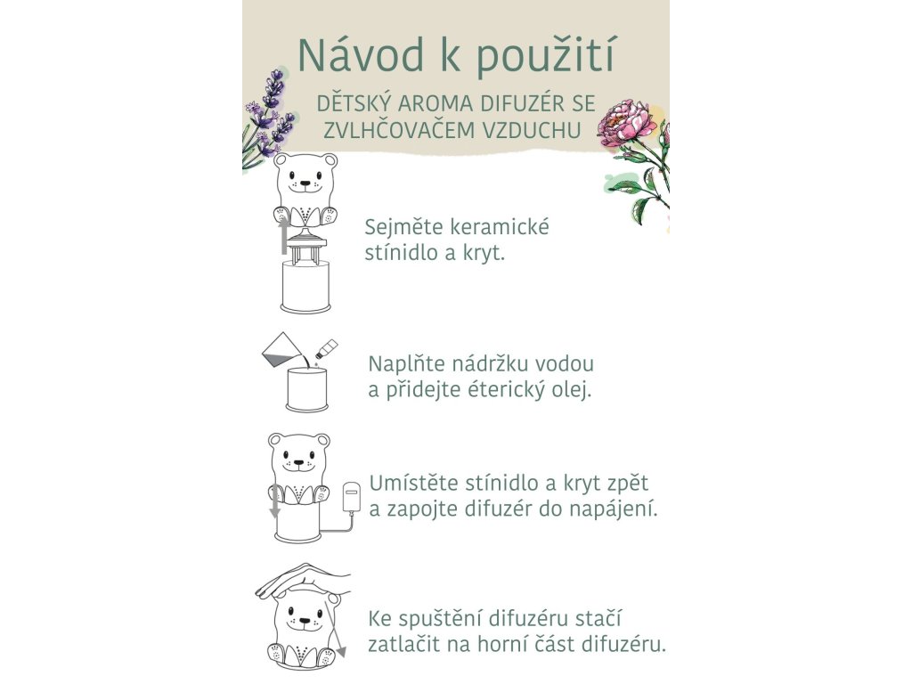POUŽITÍ: Nádobku naplňte po rysku vodou a přidejte 5–15 kapek éterických olejů. Spustíte jednoduchým stlačením. Poté, co dojde k odpaření vody, difuzér se automaticky vypne.